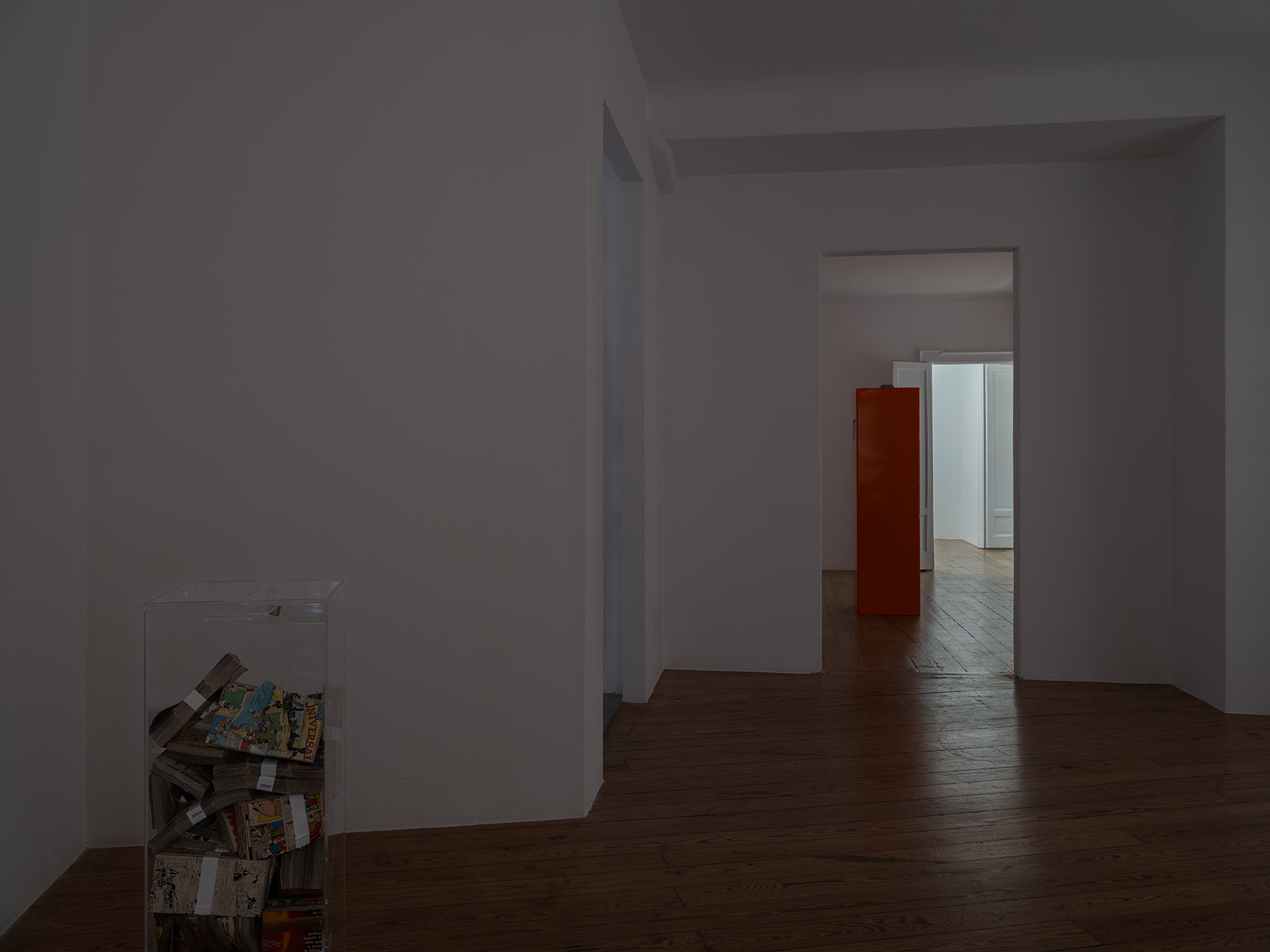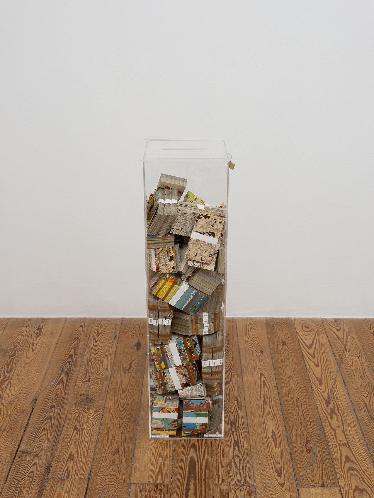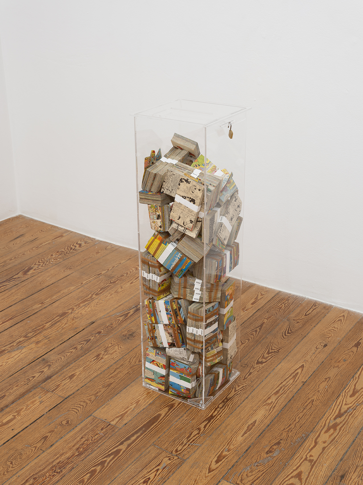 Topolino comics cutouts, rubber, tyvek, plexiglass, padlock