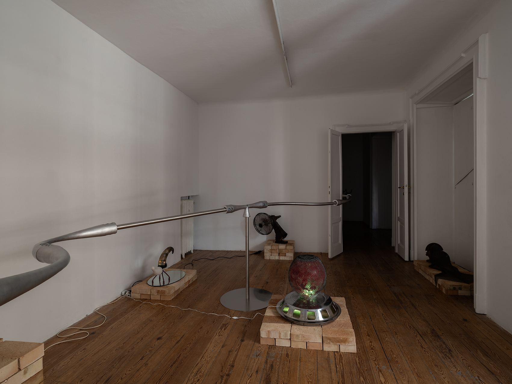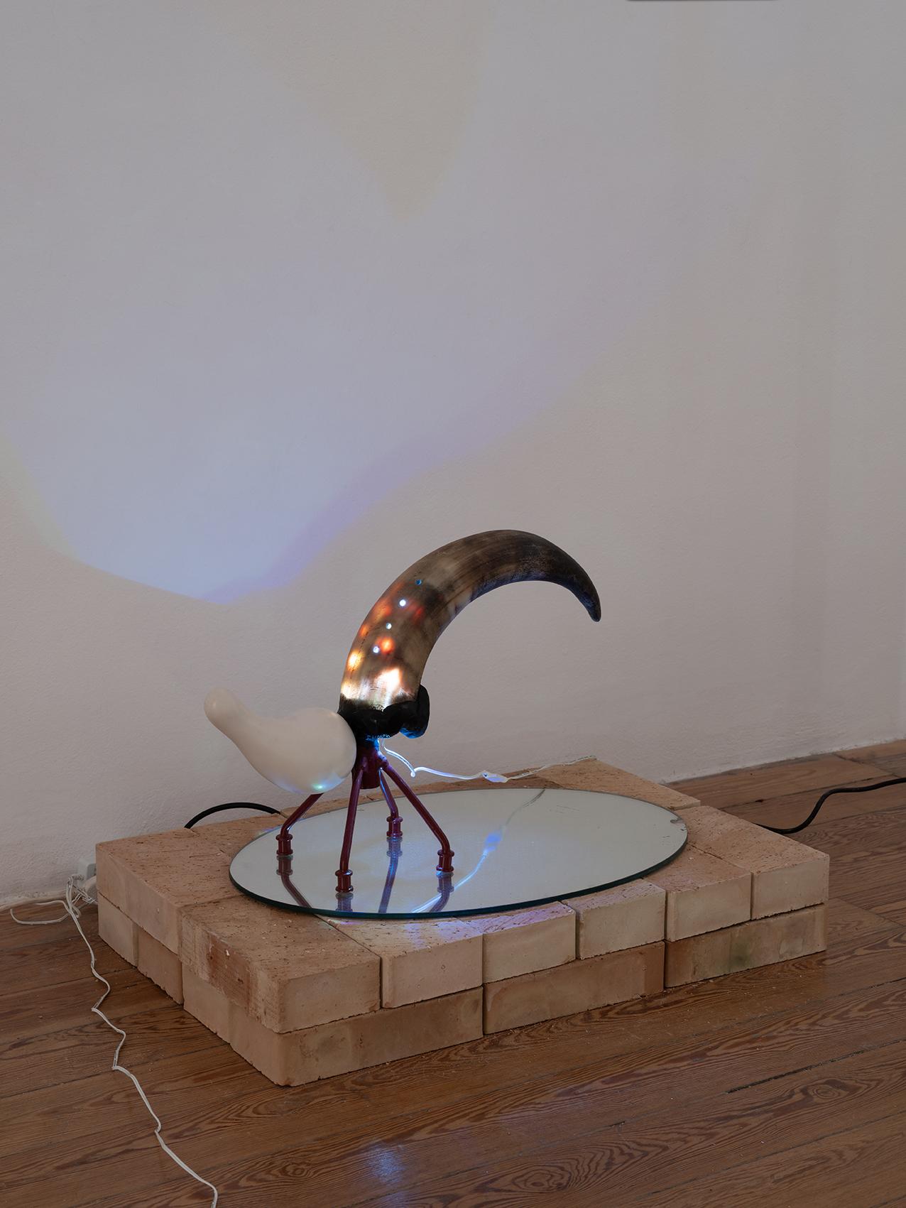 found steel table base, steel wire, Dozie's Father's cell phone (2004-2009), found toy bird, epoxy resin, acrylic paint