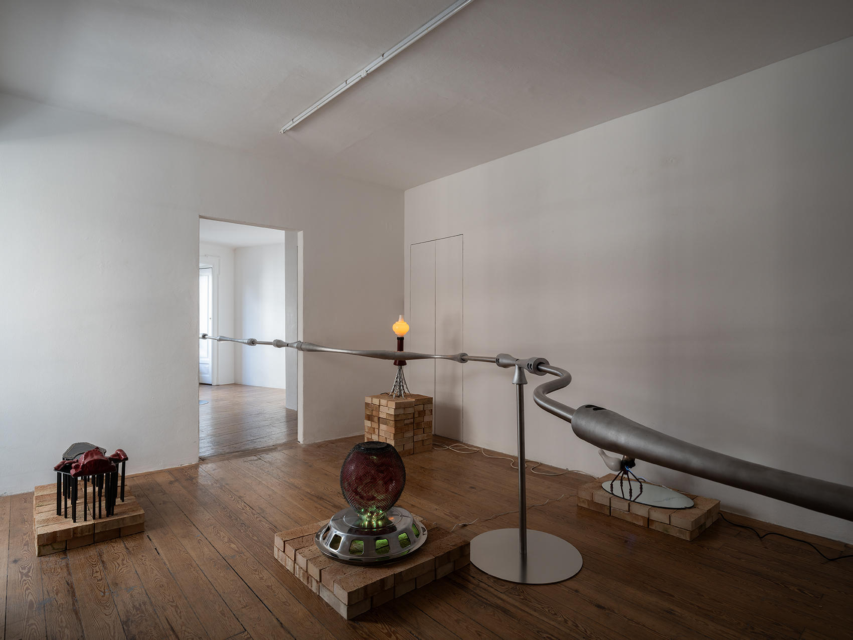 vintage car rim, metal chain link, glass flask, epoxy, acyrilic paint, electrical wiring