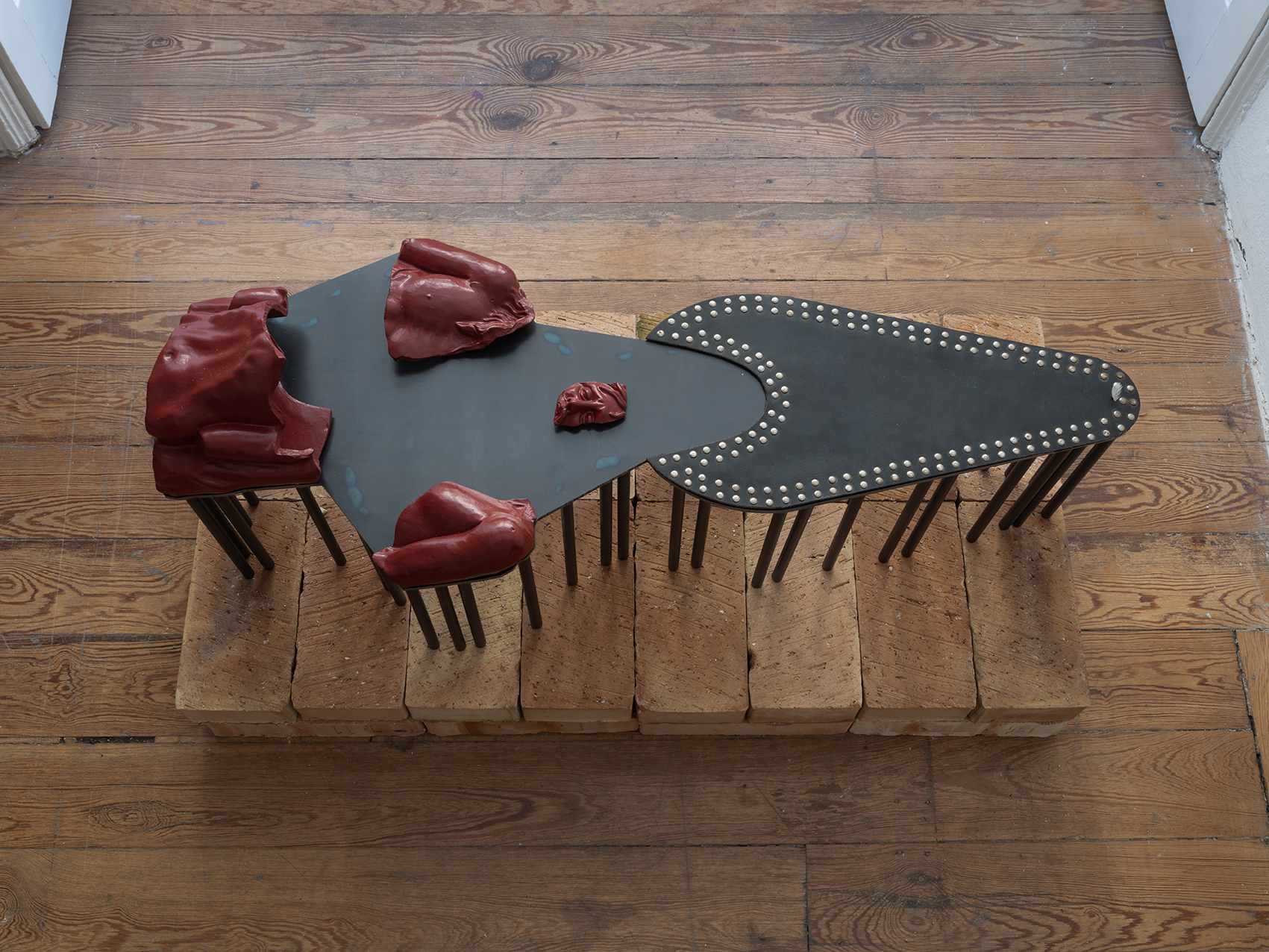 found shattered ceramic sculpture, steel, leather, epoxy glue