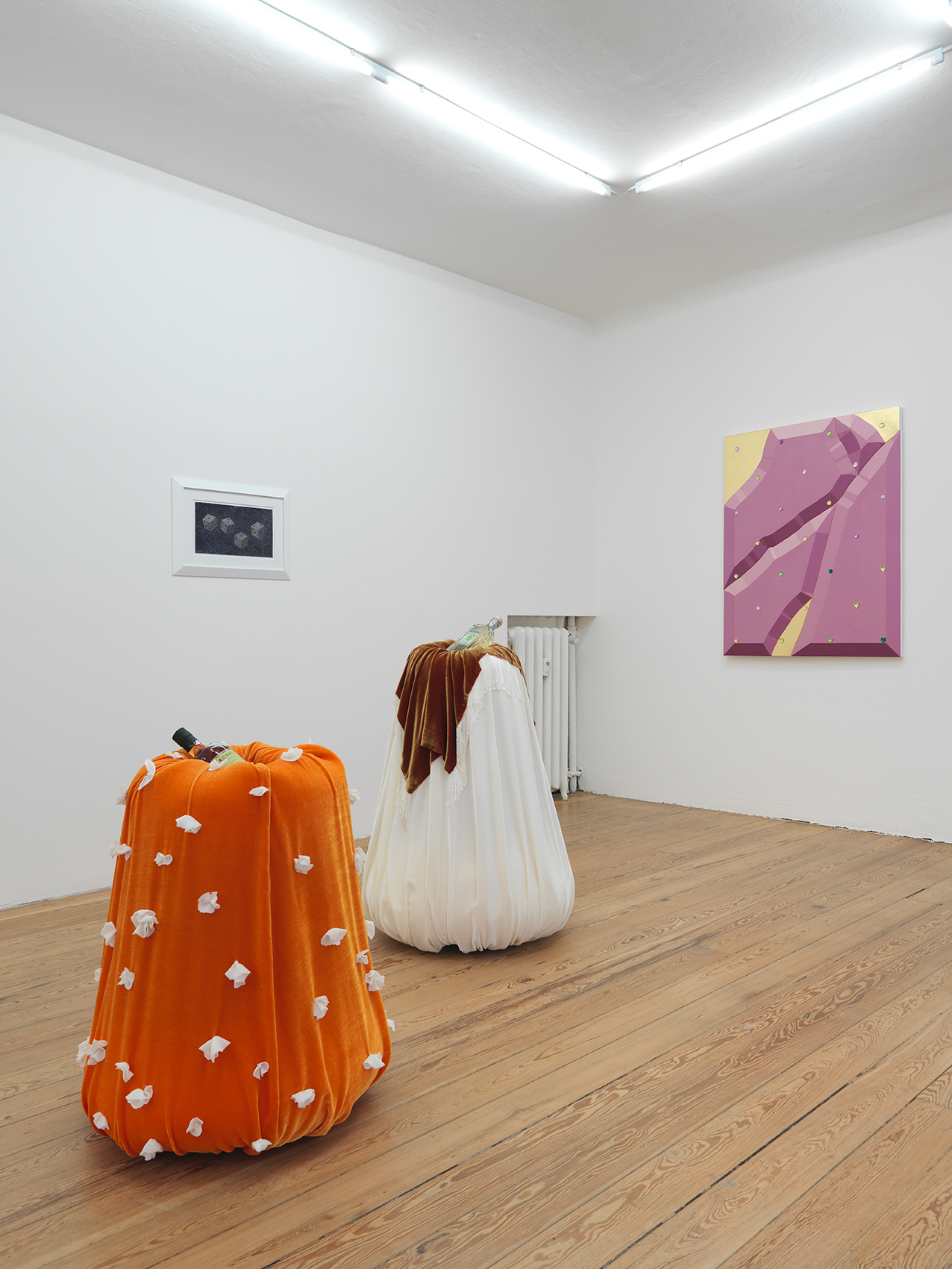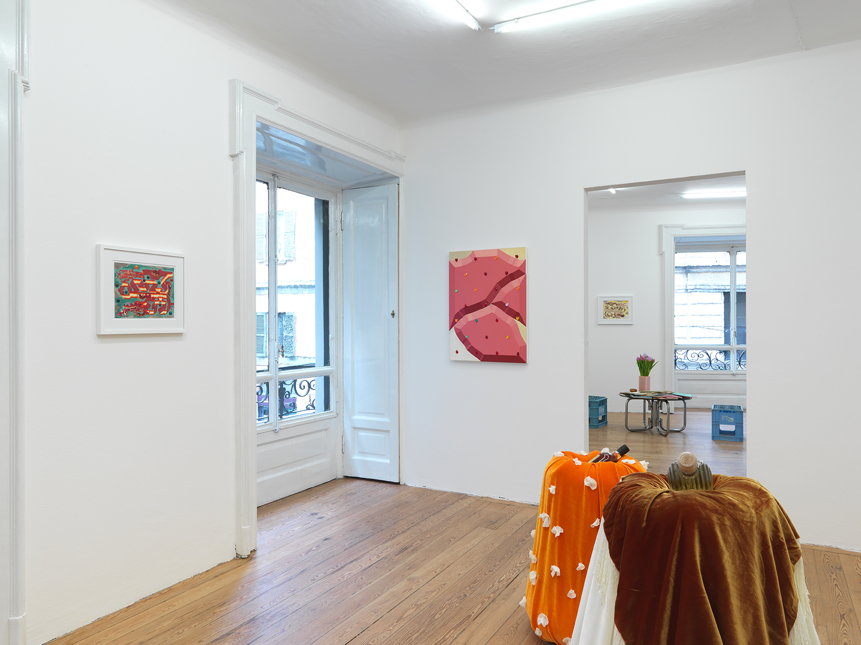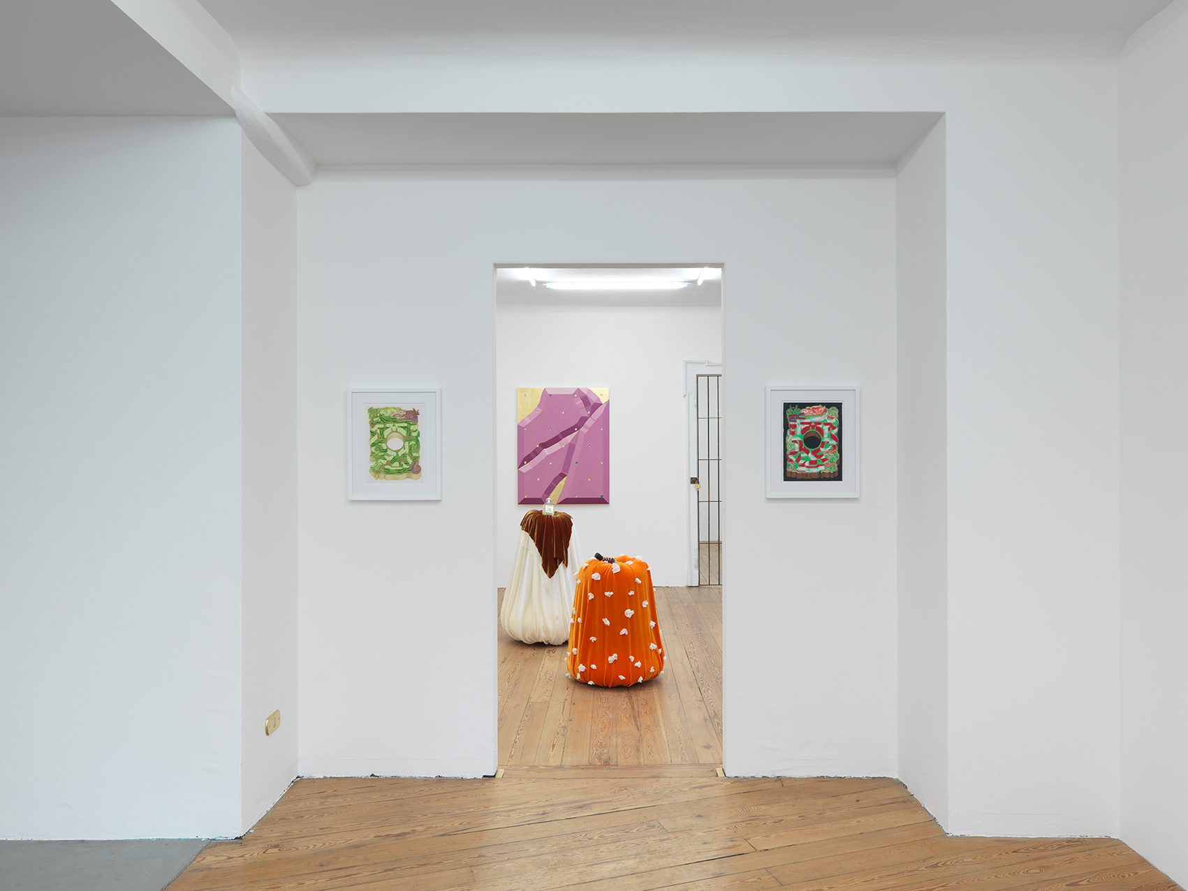 Writing on Rabelais’ medieval literature, Mikhail Bakhtin describes carnival as a suspension of societal hierarchy that draws its organic force from primordial natural law— one far more powerful than that of the patriarchal authority of priests and kings that claim to sanction it. This dissolution of the borders defining the social order is inseparable from a dissolution of the individual body. In the ecstasy of carnival, body “is not separated from the rest of the world... it is not a closed, completed unit; it is unfinished, outgrows itself, transgresses its own limits... The [literary] stress is laid on those parts of the body that are open to the outside world, that is, the parts through which the world enters the body or emerges from it, or through which the body itself goes out to meet the world.” Bas-relief, holes, self-enfolding or unfolding objects are present in this exhibition as well. Bakhtin characterizes this mode as the archaic grotesque.