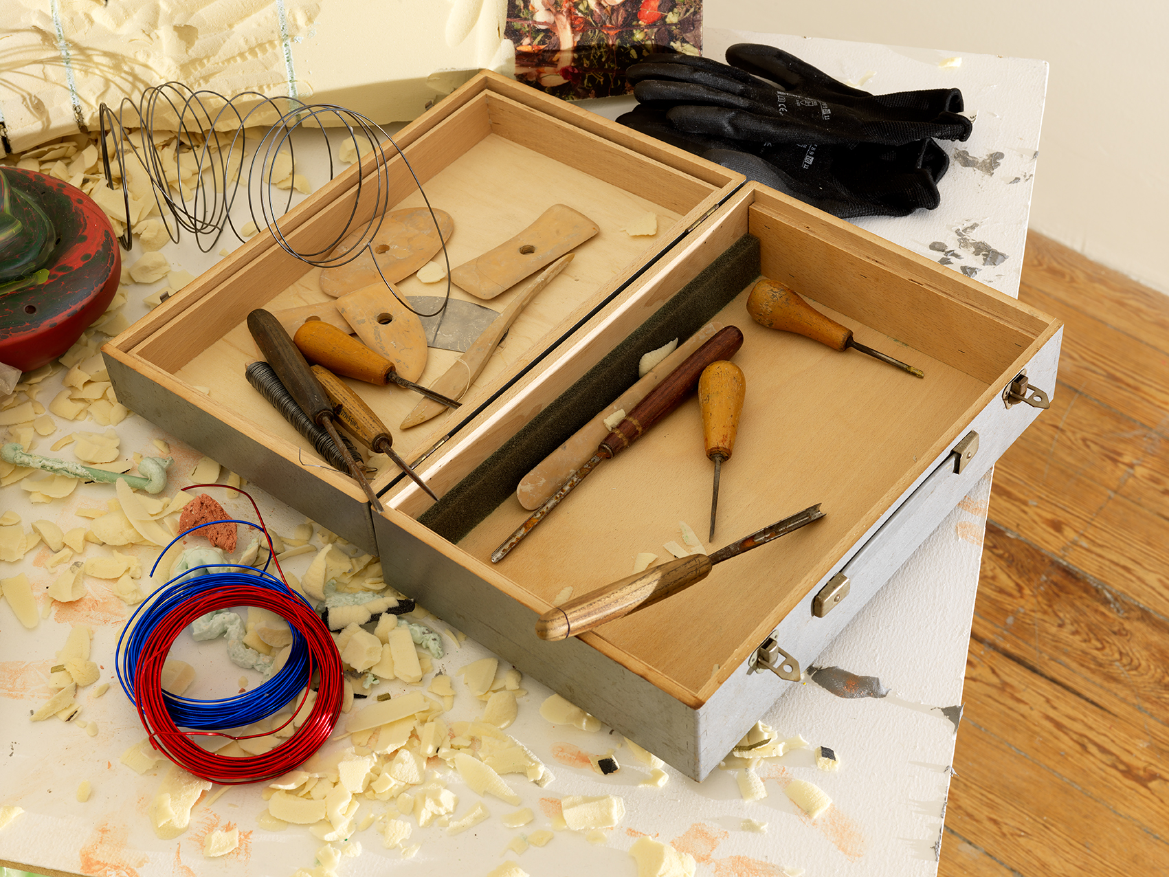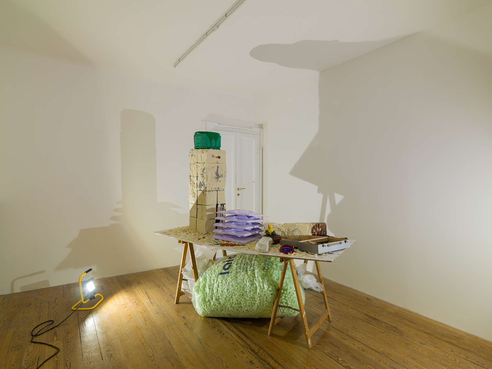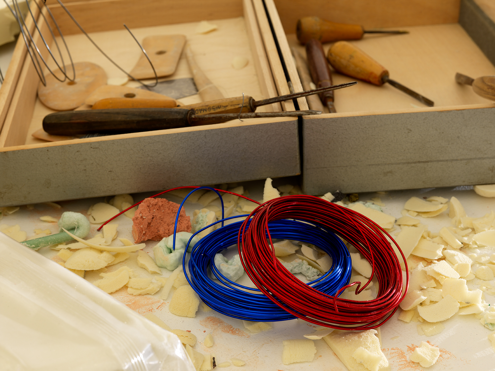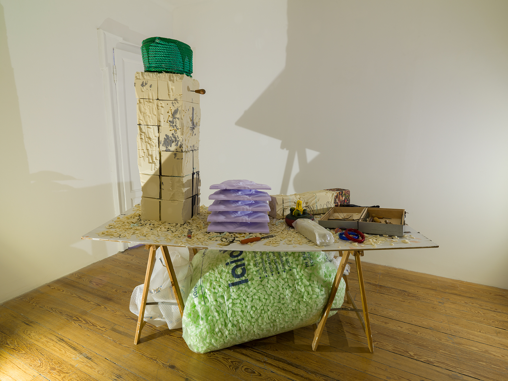 Kaspar Müller Do it to do it, 2022 Table, styrofoam, carving tools, gloves, rope, packing material, cnc-carved isolation foam, metal wire, wooden box, vintage photograph, hand-blown glass pumpkin, paint, inkjet print, plastic, clay 182 x 190 x 75 cm
