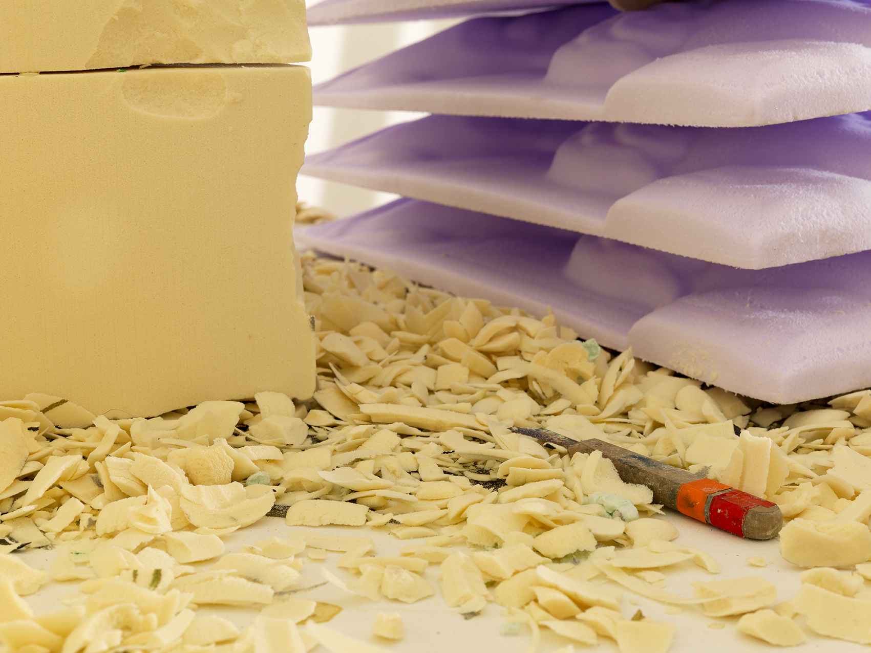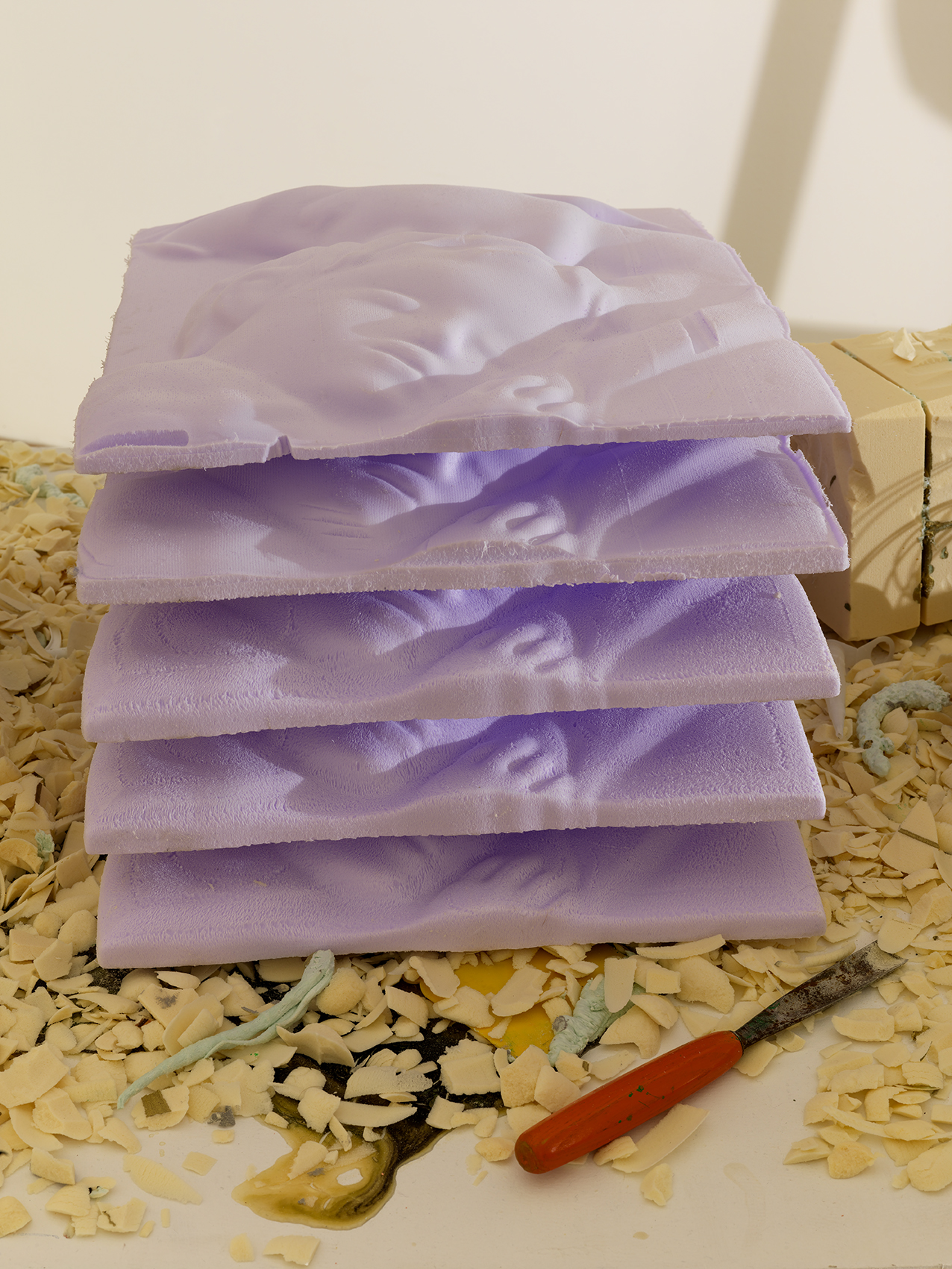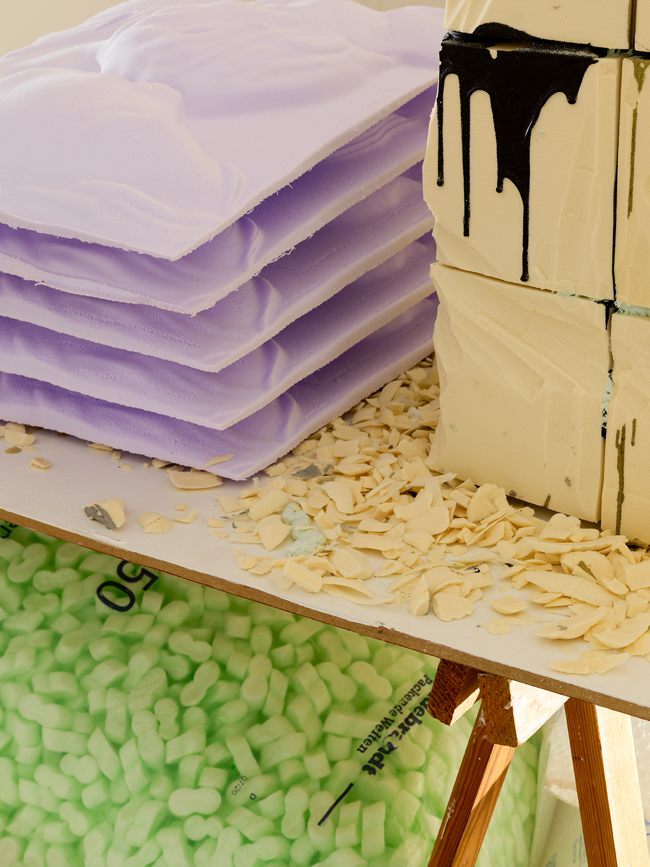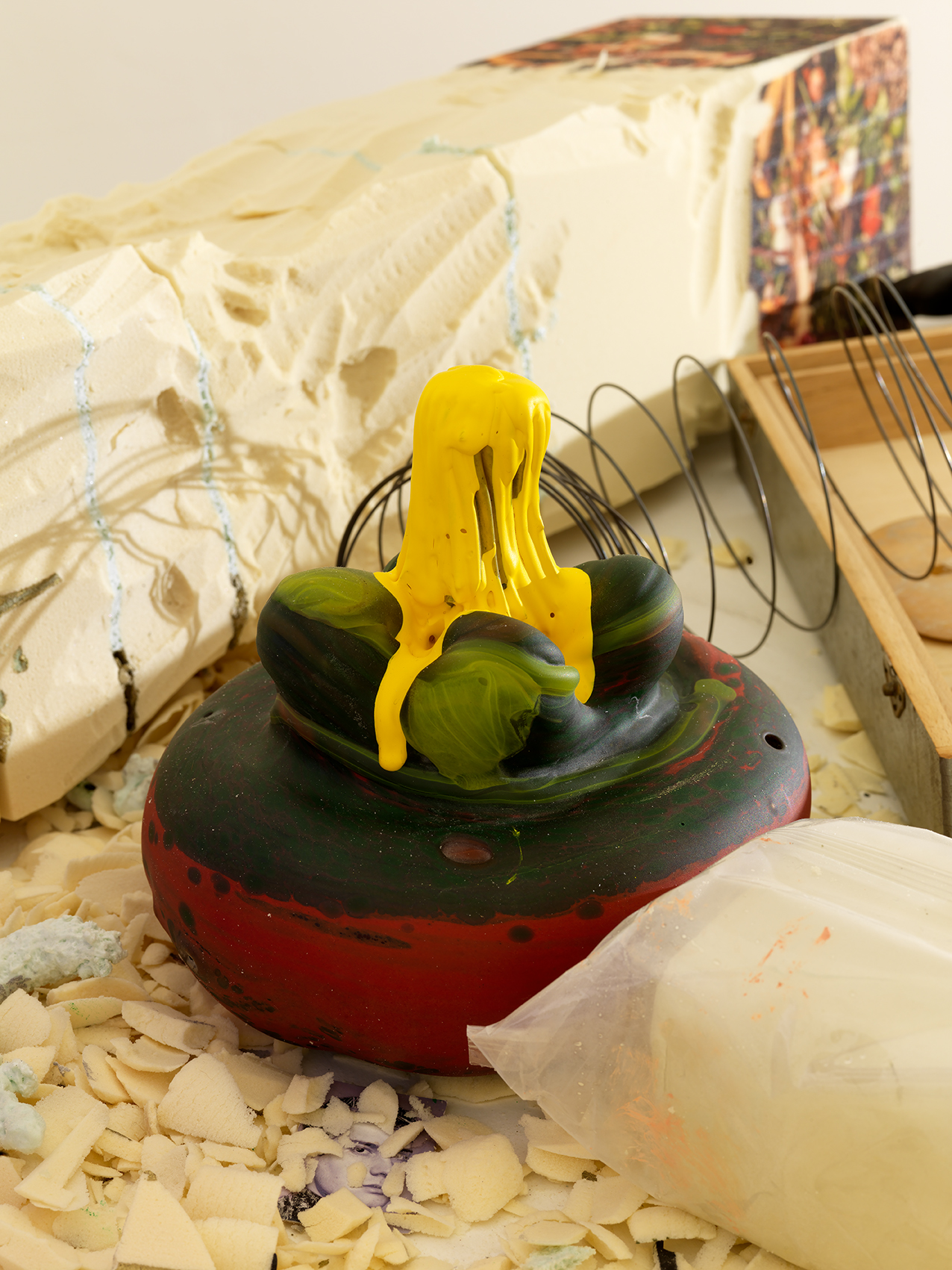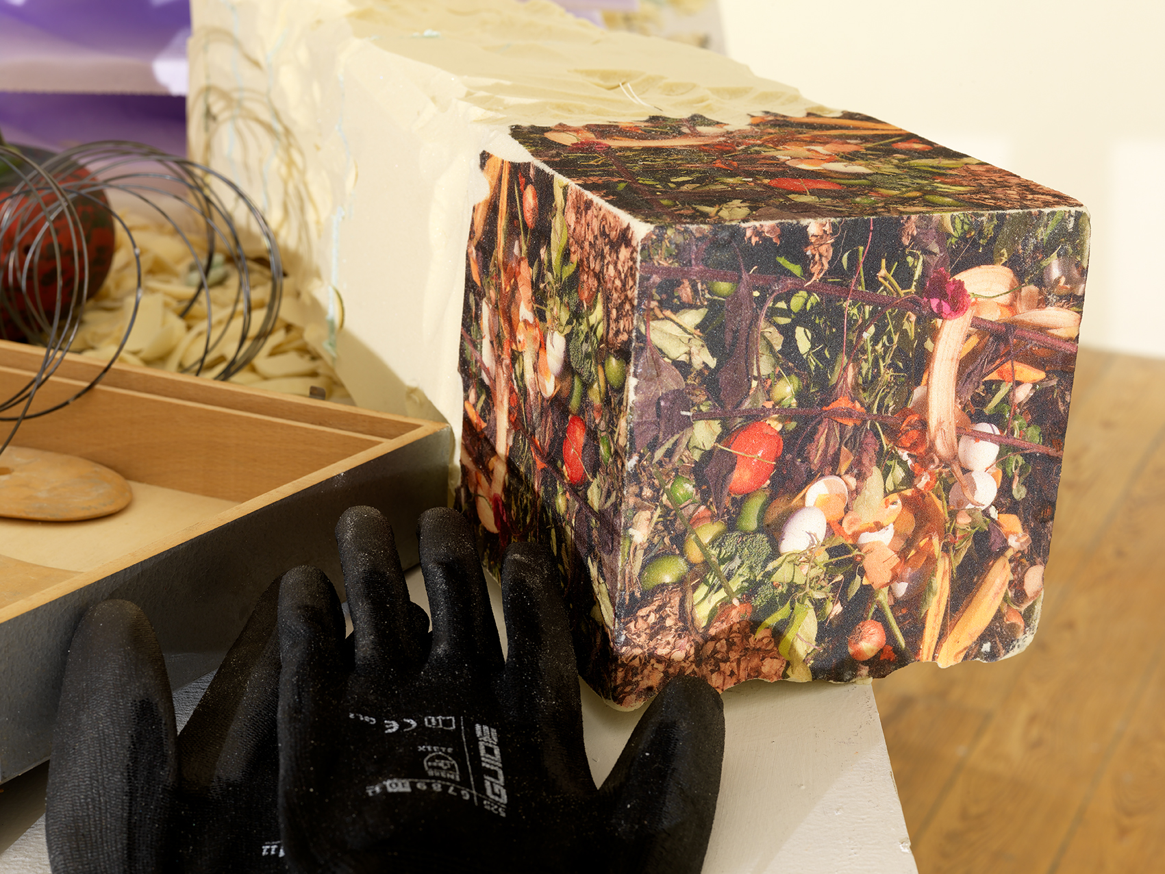 Kaspar Müller Do it to do it, 2022 Table, styrofoam, carving tools, gloves, rope, packing material, cnc-carved isolation foam, metal wire, wooden box, vintage photograph, hand-blown glass pumpkin, paint, inkjet print, plastic, clay 182 x 190 x 75 cm