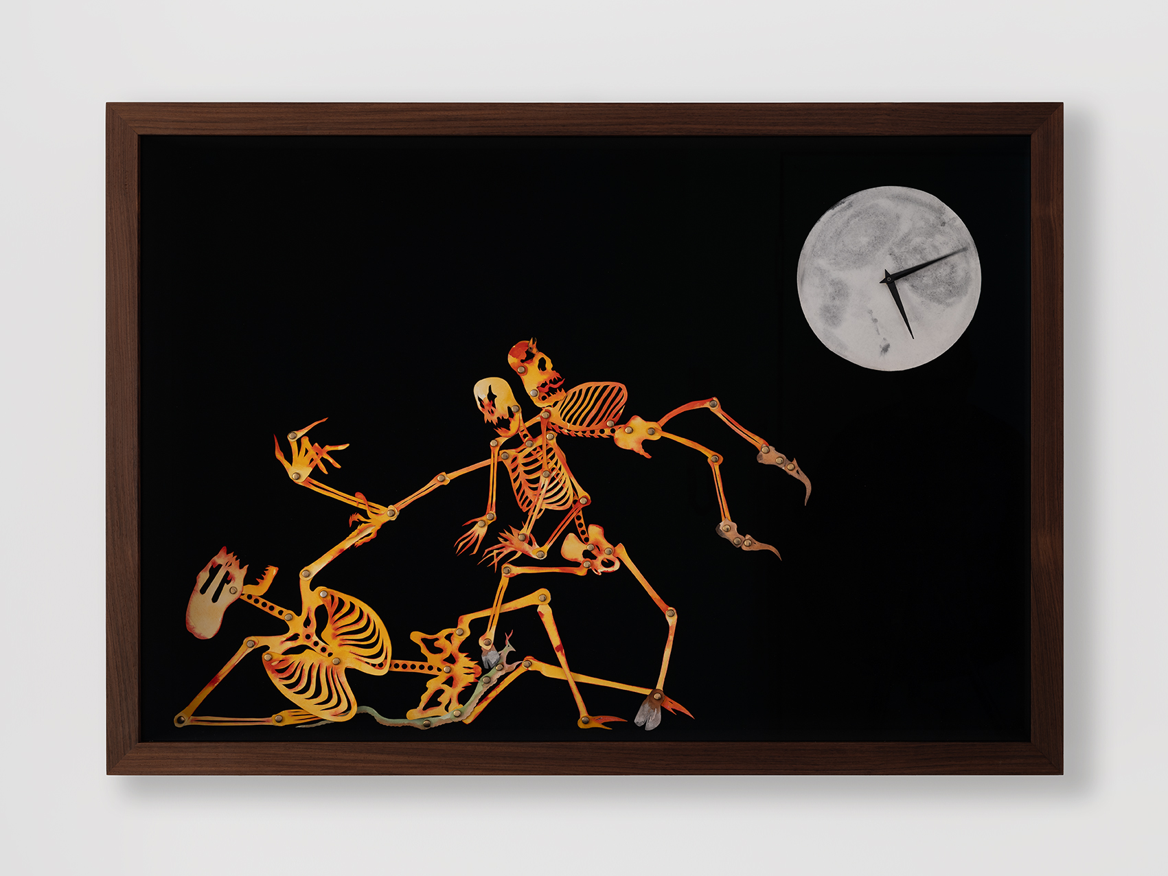 Watercolor on paper, split pin, quartz movement, rosewood, flok