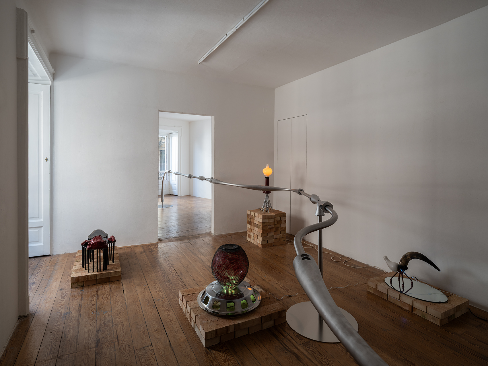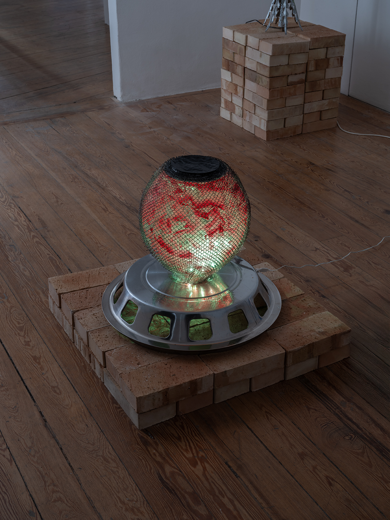 vintage car rim, metal chain link, glass flask, epoxy, acyrilic paint, electrical wiring