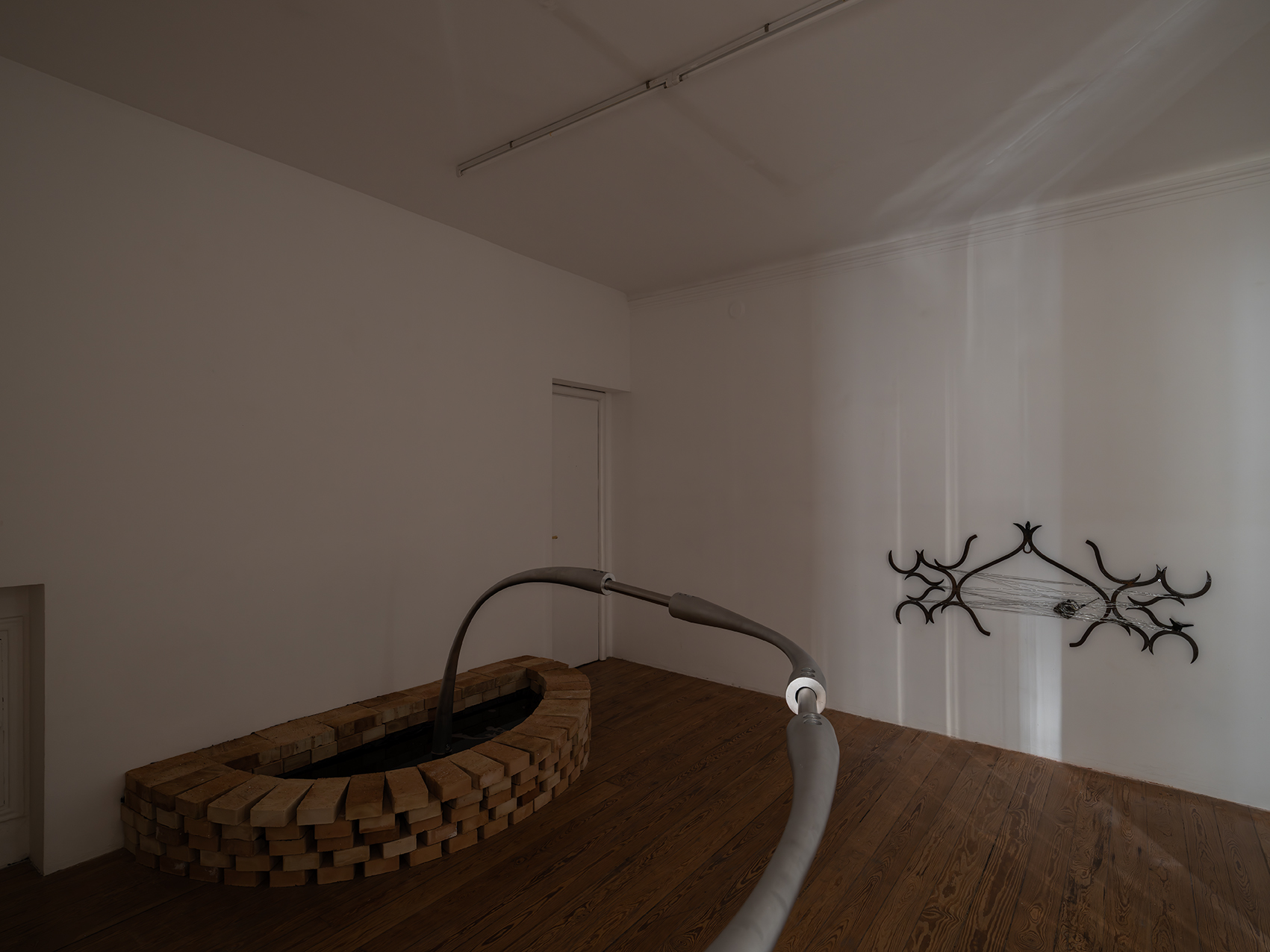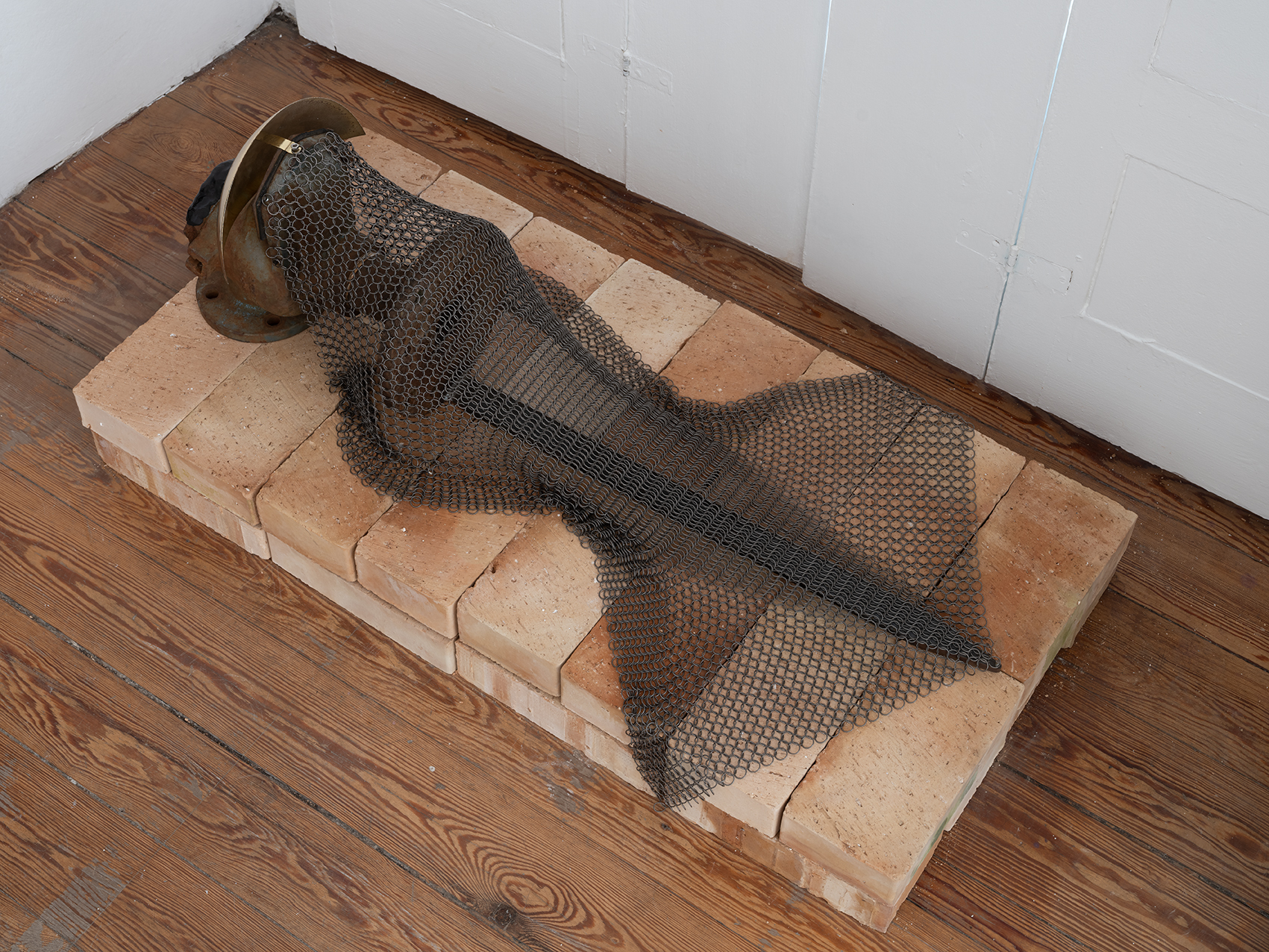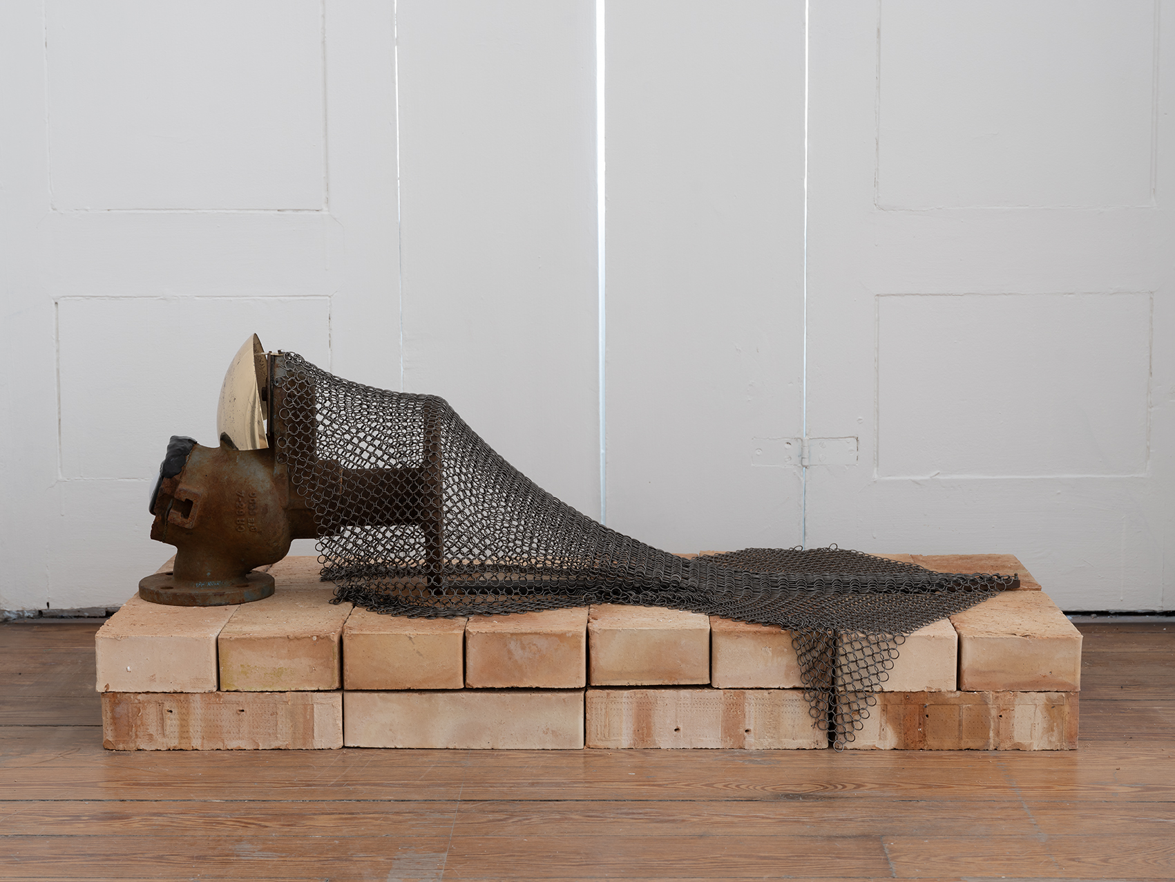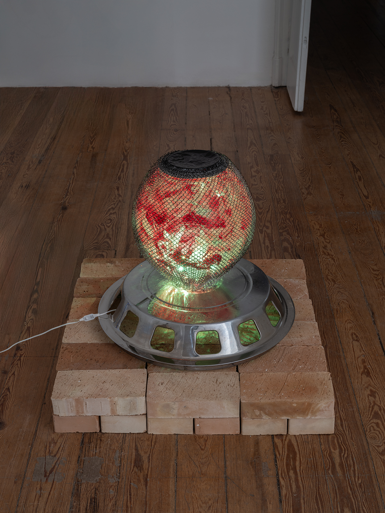 found plumbing component, chain link net, brass, steel, battery powered light, epoxy resin, screws, acrylic paint