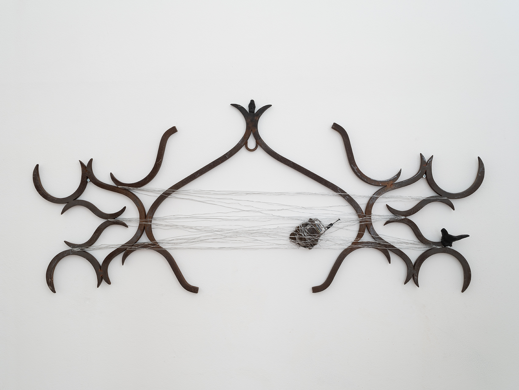 found steel table base, steel wire, Dozie's Father's cell phone (2004-2009), found toy bird, epoxy resin, acrylic paint