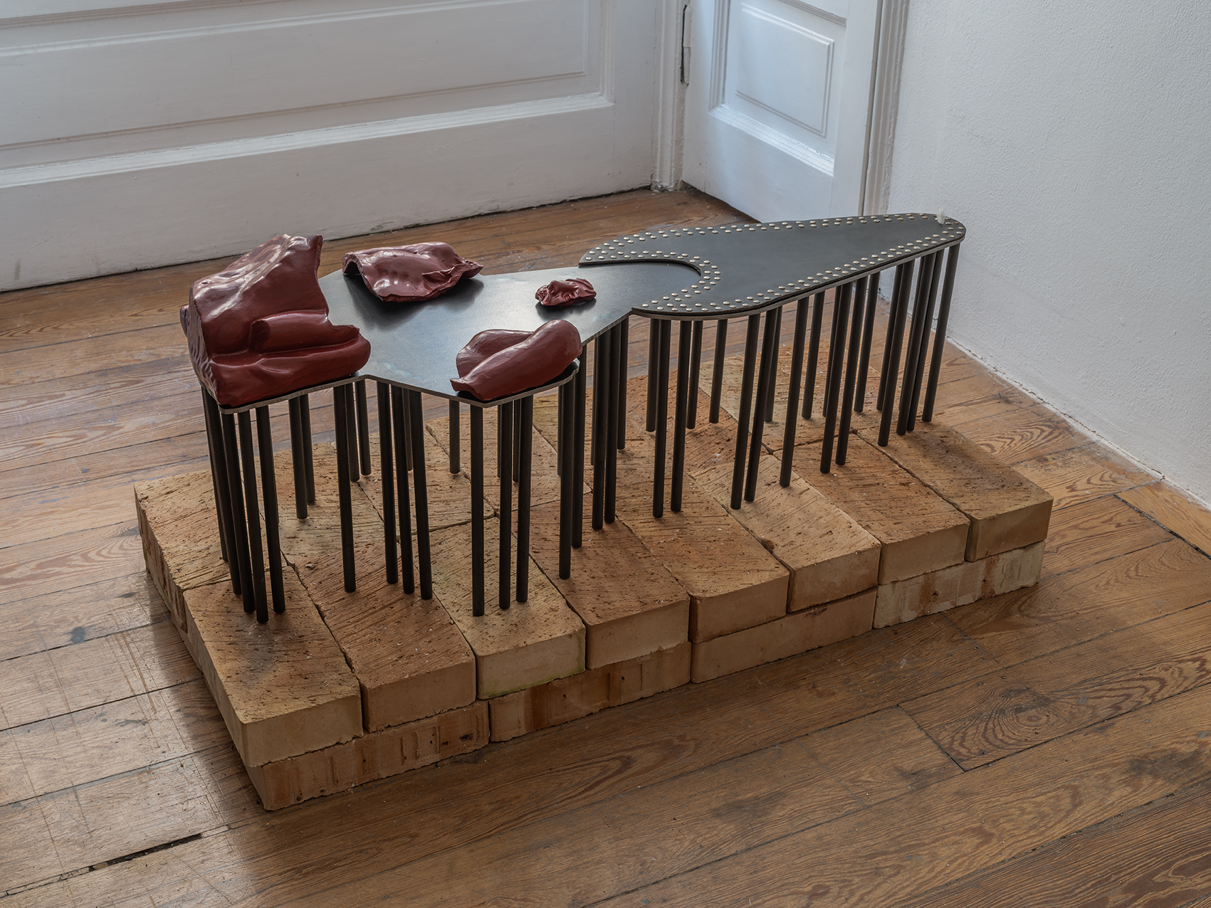 found shattered ceramic sculpture, steel, leather, epoxy glue