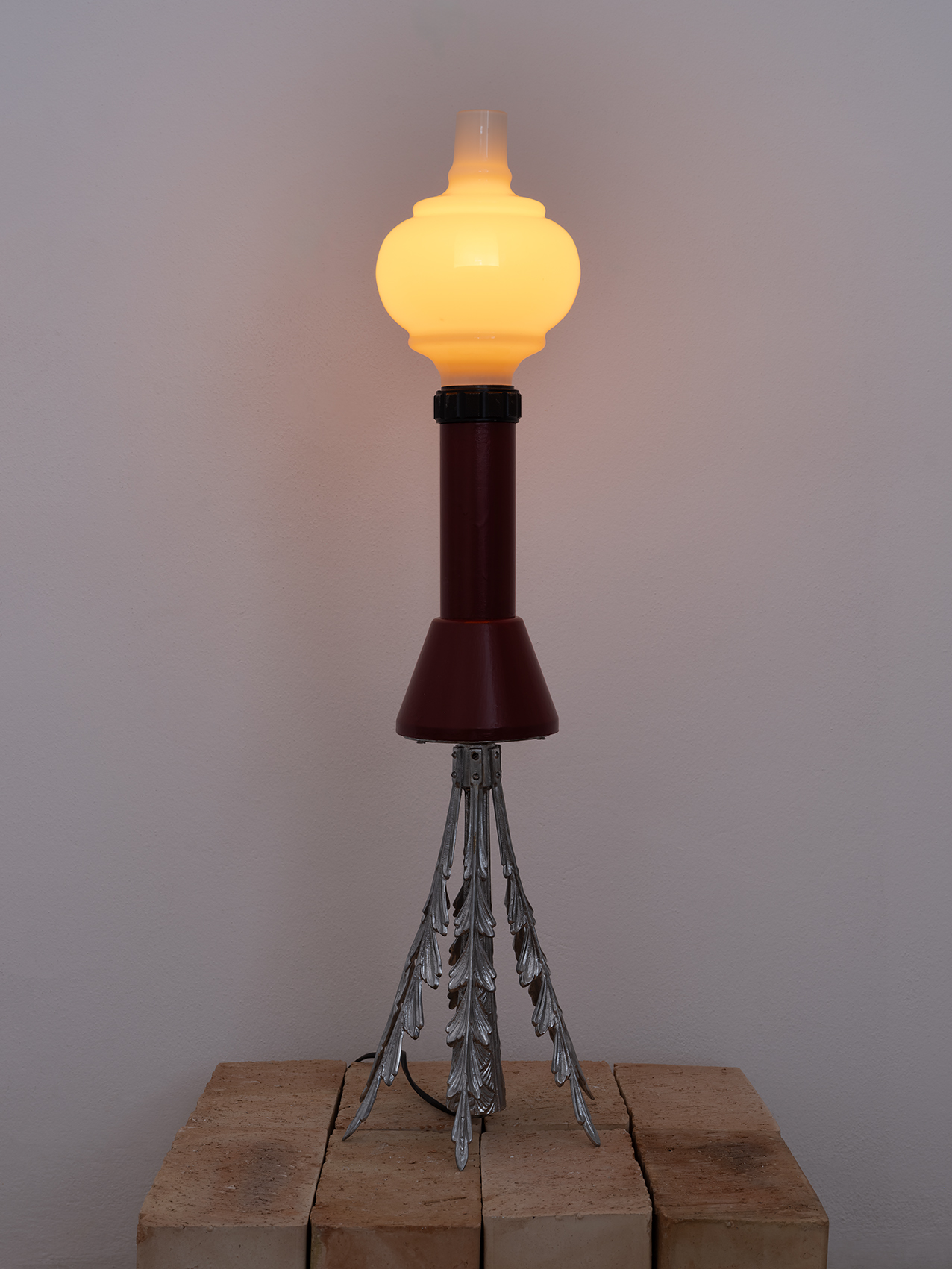 simulated flame bulb, found glass component, found microscope component, found chandelier component.