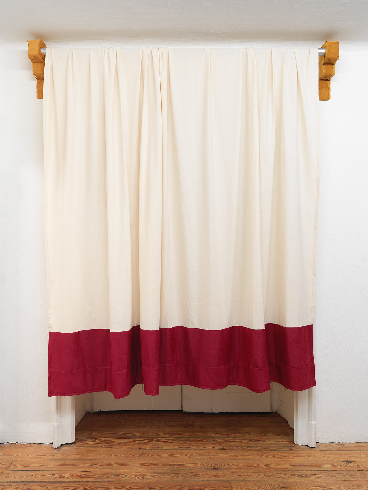 EMK’s 3-meter artworks are installed like curtains in an apartment. They are attached to rods with brackets at either end. But EMK’s works differ from conventional curtains by dint of their absence of fastenings and the length of the fabrics. He drapes them over a rod like the materials on display in a drapery. By doubling the fabric, he creates potential hiding places, while alluding to the separation of the two layers involved in making velvet: duplication is intrinsic to the material.