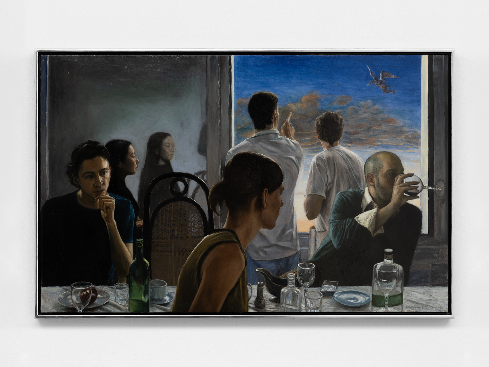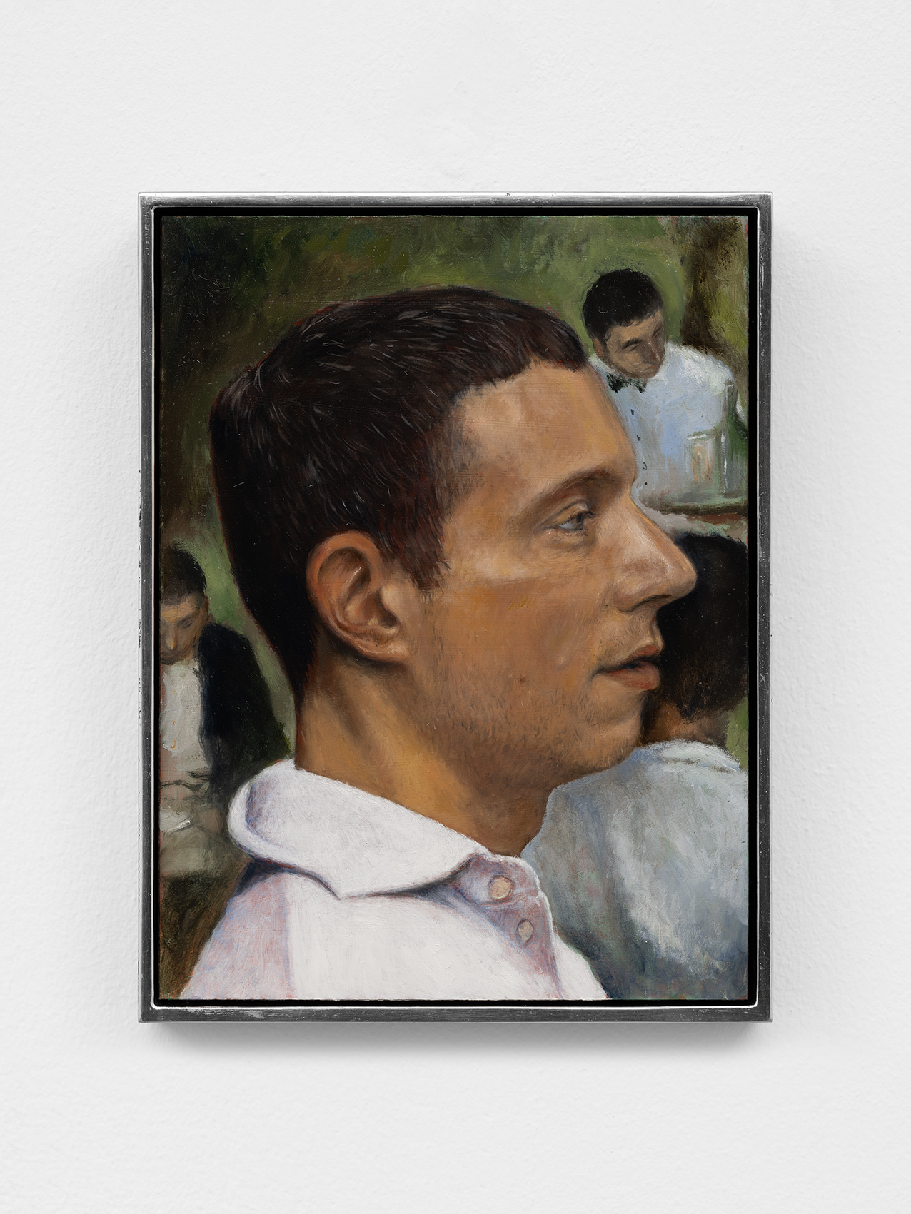 Giangiacomo Rossetti De temps en temps j'aime à voir le vieux Père, Et je me garde bien de lui rompre en Visière, 2024, 2024 Oil on panel 77,2 x 120,3 x 4,7 cm (framed)