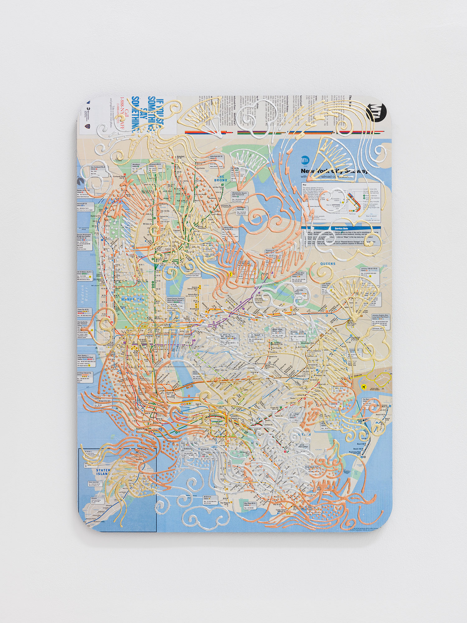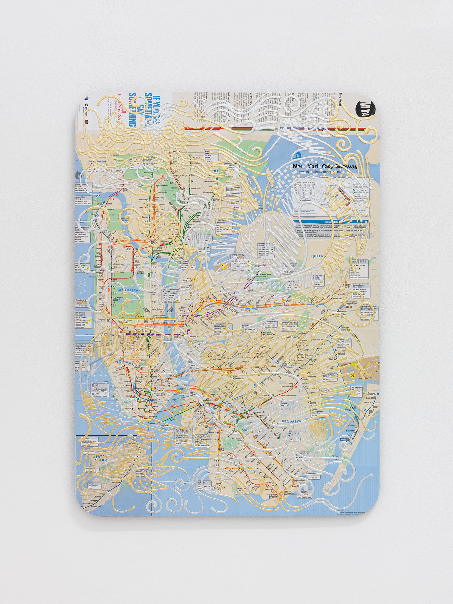 This series borrows from DIY autobiographical comics, collected by the artist in small bookstores in various US cities; and a type of graffiti influenced street art, often drawn on hats or subway maps, for sale to SoHo tourists.