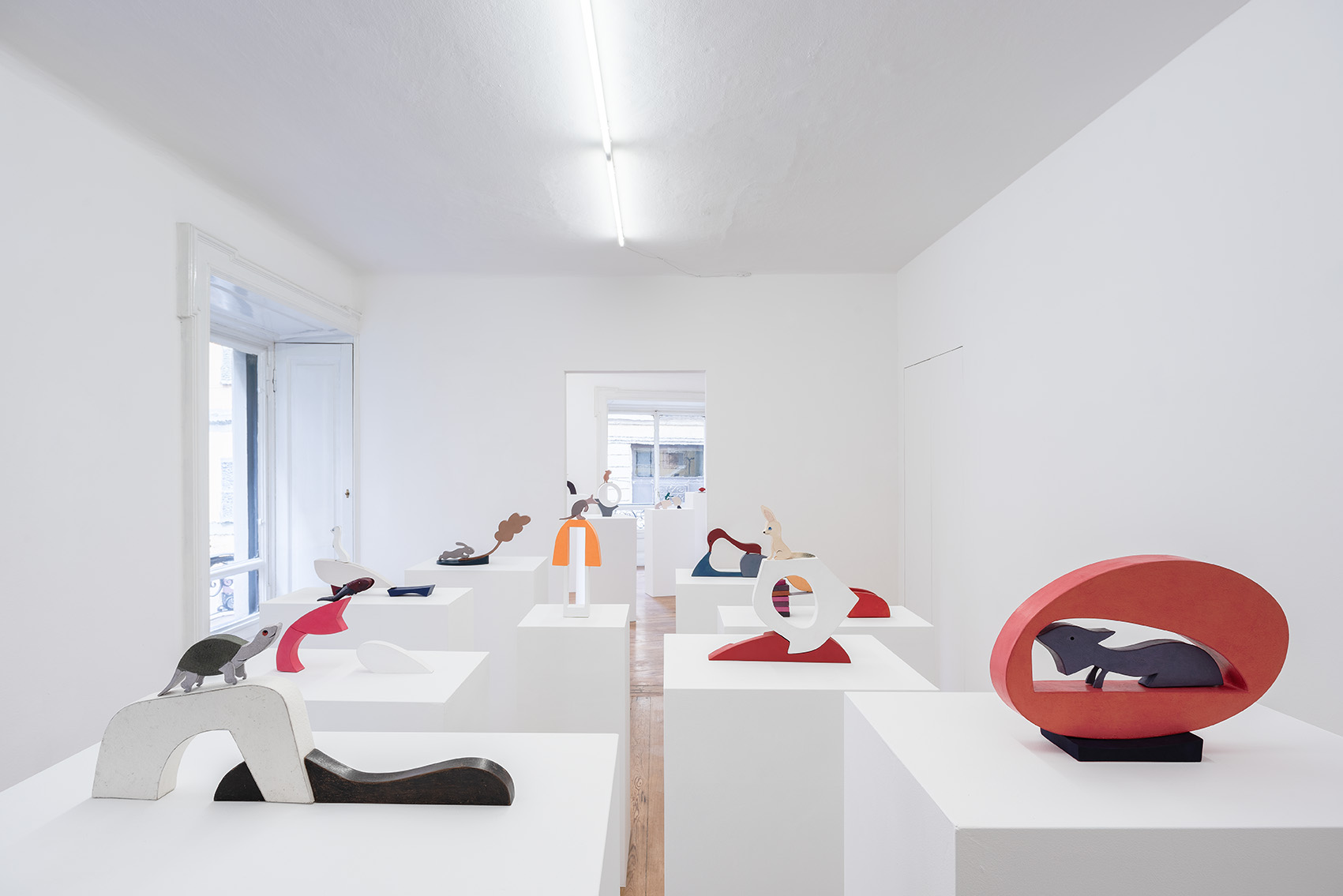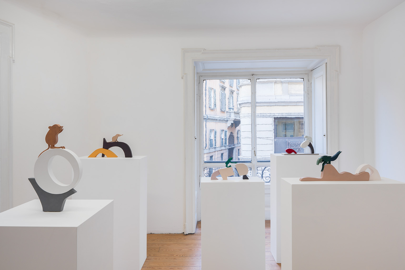 Games of wavy, slide-like shapes, ascending and descending planes, squared and rounded shapes evoke abstract habitable landscapes. Pedestals made to measure for different animals, which, from Volpino grigio to Cagnino comune, from Topo delle piramidi to Grillo dei cespugli, or from Volpe del deserto to Formichiere, to Lucertola Pinocchio, give life to a playful bestiary, converting Doriana’s original attitude towards the very smallest into an aspiration to the monumental.