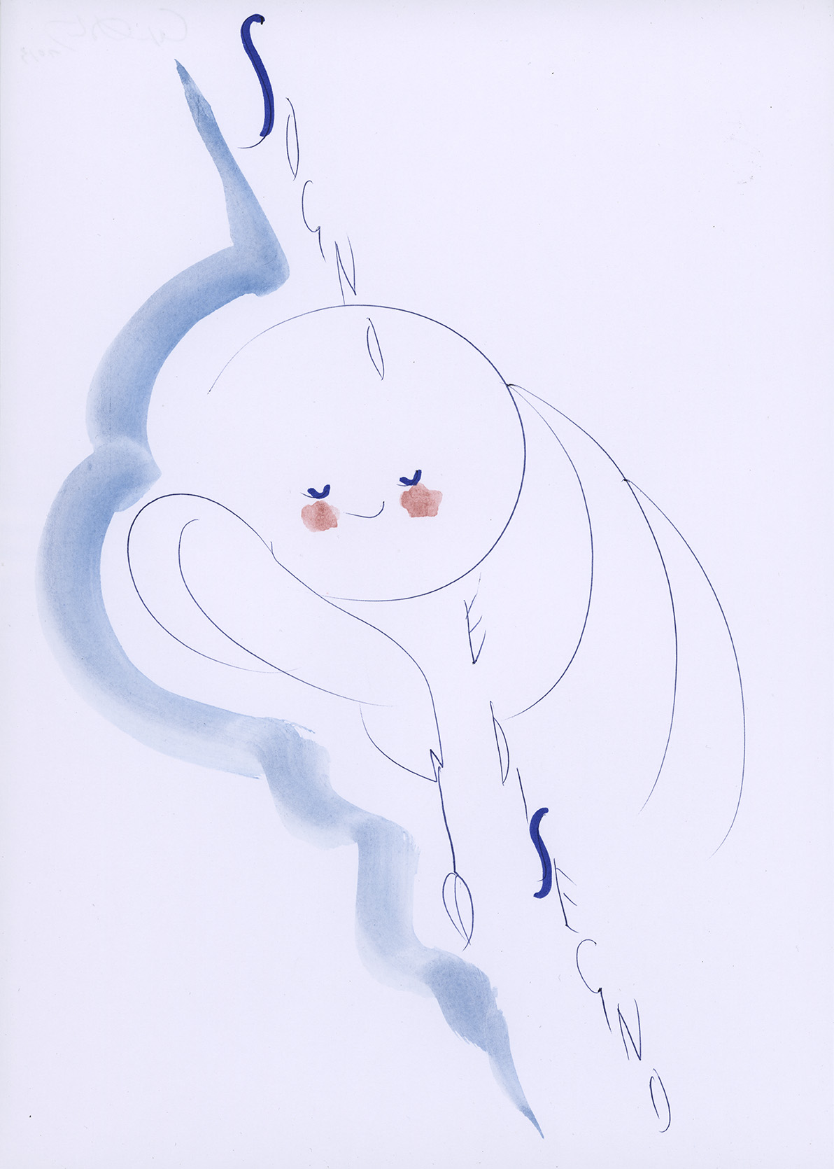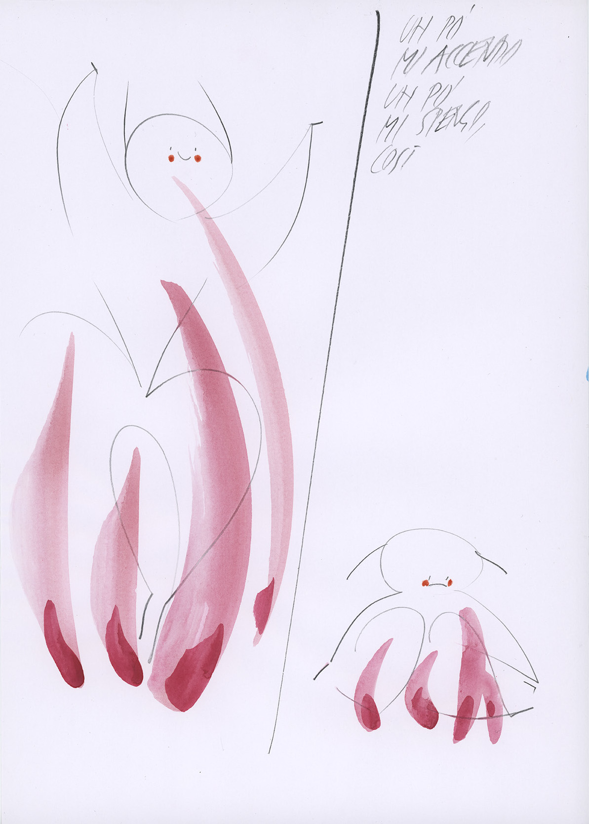 Lisa’s drawings as well appear to me more as pictograms than – as they say – messages; I see them more as appearances and epiphanies, than actual declarations.