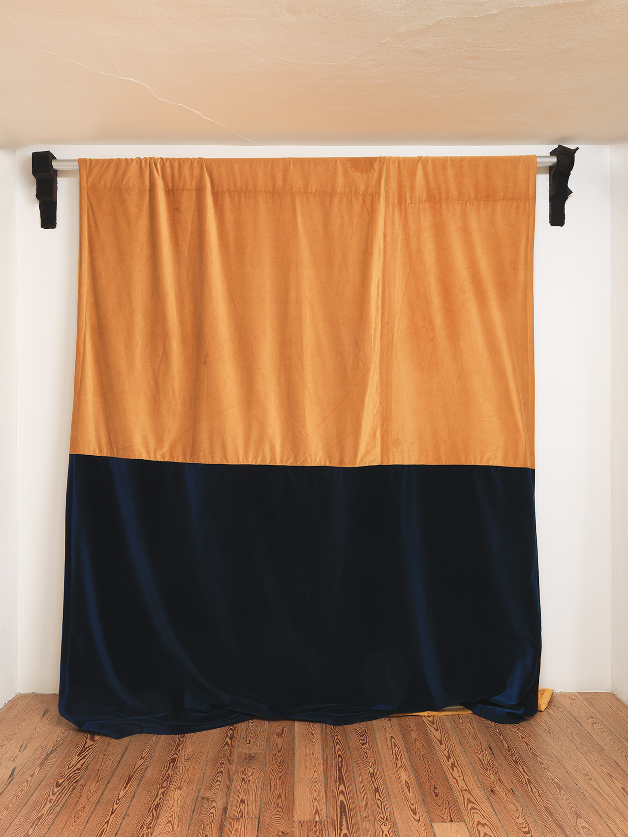 EMK’s 3-meter artworks are installed like curtains in an apartment. They are attached to rods with brackets at either end. But EMK’s works differ from conventional curtains by dint of their absence of fastenings and the length of the fabrics. He drapes them over a rod like the materials on display in a drapery. By doubling the fabric, he creates potential hiding places, while alluding to the separation of the two layers involved in making velvet: duplication is intrinsic to the material.